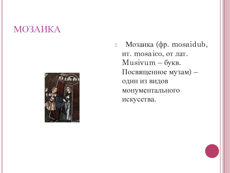 МОЗАИКА Мозаика (фр. mosaidub, ит. mosaico, от лат. Musivum – букв. Посвященное музам) – один из видов