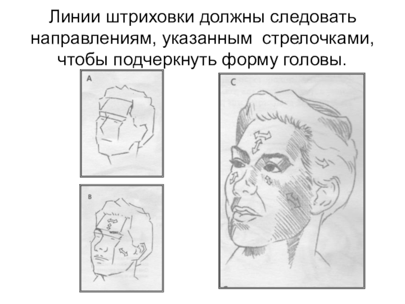 Слайд 4Линии штриховки должны следовать направлениям, указанным стрелочками, чтобы подчеркнуть форму головы.