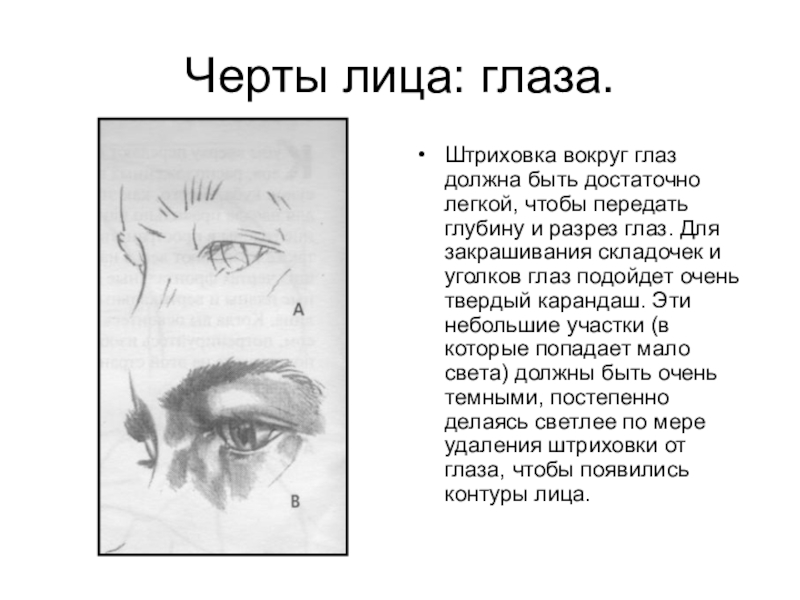 глубину и разрез глаз. Для закрашивания складочек и уголков глаз подойдет очень твердый карандаш. Эти небольшие участки (в которые попадает мало света) должны быть очень темными, постепенно делаясь светлее по мере удаления штриховки от глаза, чтобы появились контуры лица.