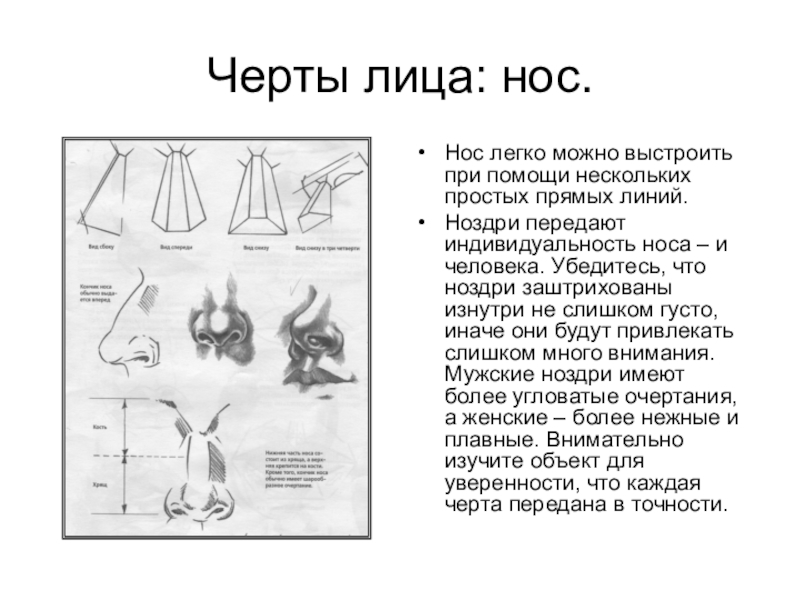 Черты лица: нос.Нос легко можно выстроить при помощи нескольких простых прямых линий. Ноздри передают индивидуальность носа –