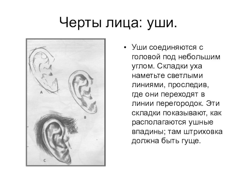 Черты лица: уши.Уши соединяются с головой под небольшим углом. Складки уха наметьте светлыми линиями, проследив, где они
