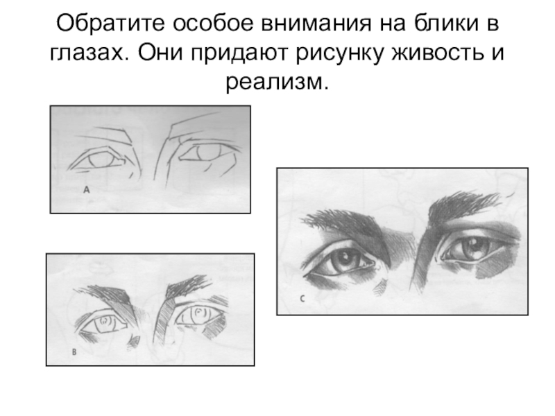 Слайд 5Обратите особое внимания на блики в глазах. Они придают рисунку живость