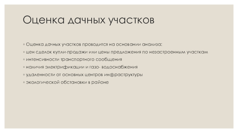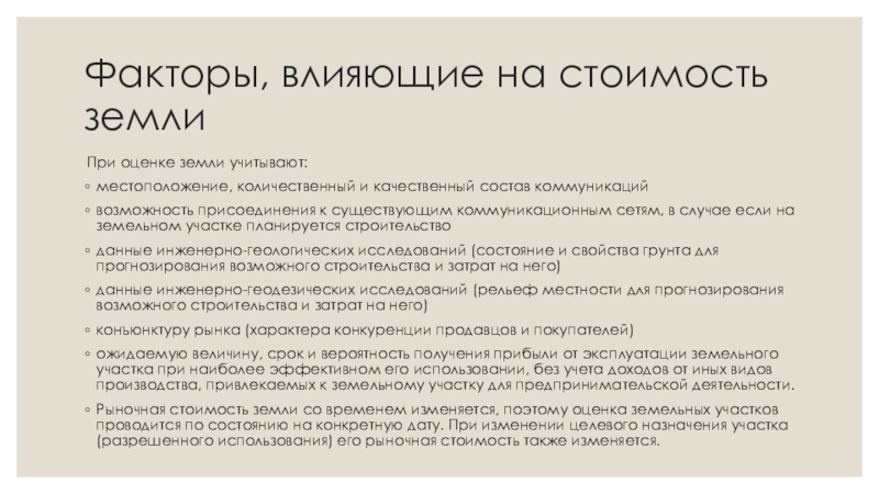 Рыночная стоимость земли со временем изменяется, поэтому оценка земельных участков проводится по состоянию на конкретную дату. При изменении целевого назначения участка (разрешенного использования) его рыночная стоимость также изменяется.