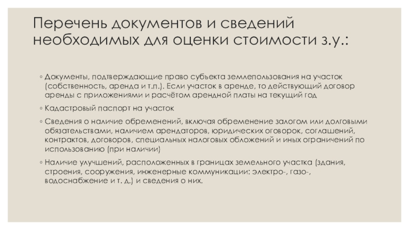 Слайд 9Перечень документов и сведений необходимых для оценки стоимости з.у.: