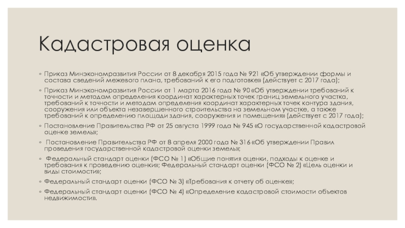 количество федеральных законов, стандартов и постановлений, касающихся оценки земель. Среди них: Земельный кодекс РФ;