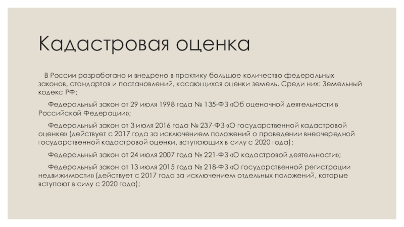Федеральный закон от 3 июля 2016 года № 237-ФЗ «О государственной кадастровой оценке» (действует с 2017 года за исключением положений о проведении внеочередной государственной кадастровой оценки, вступающих в силу с 2020 года);