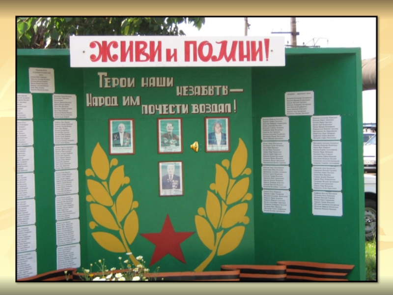 Памятник был установлен к юбилею Победы в 1985году. На аллее Славы расположено 14 мемориальных плит с име-нами погибших воинов. В праздничные дни горит Веч-ный огонь.