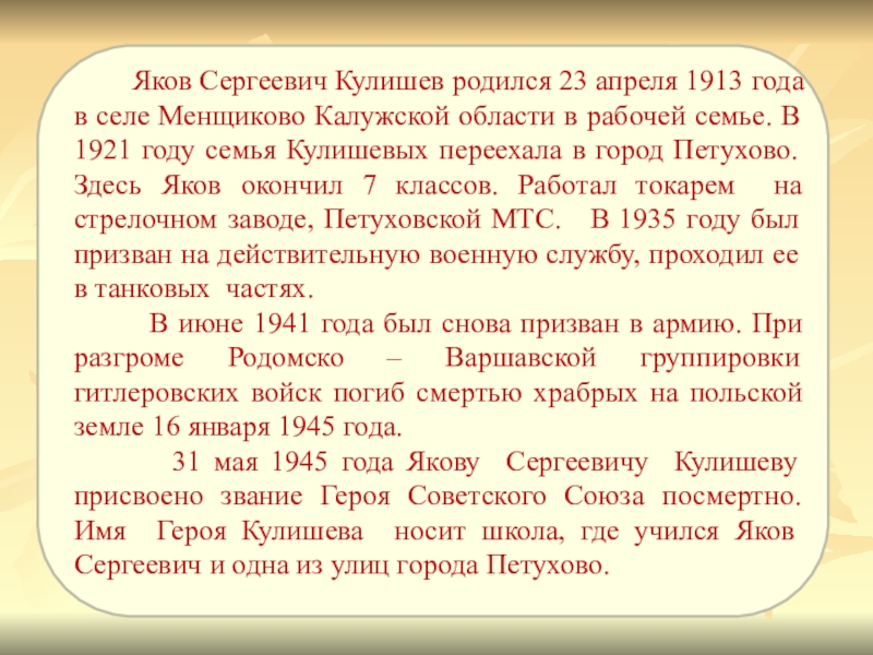 Яков Сергеевич Кулишев родился 23 апреля 1913