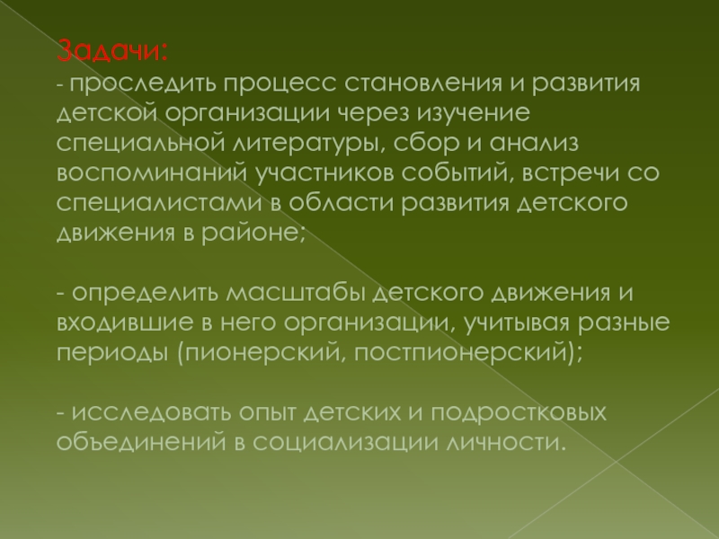Задачи:  - проследить процесс становления и развития детской организации через изучение специальной литературы, сбор и анализ