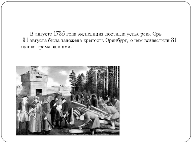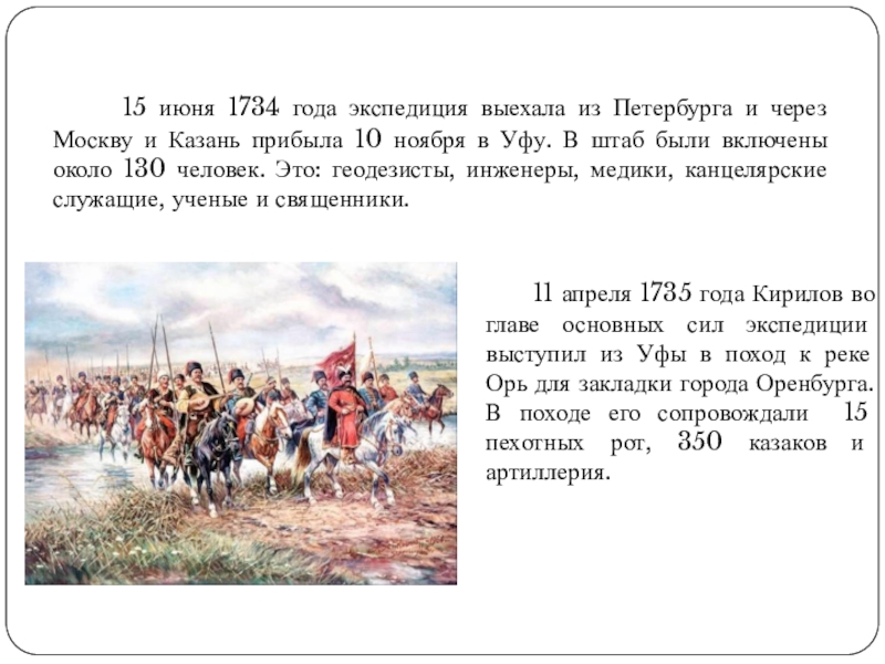 11 апреля 1735 года Кирилов во главе основных сил экспедиции выступил из Уфы в поход к реке Орь для закладки города Оренбурга. В походе его сопровождали 15 пехотных рот, 350 казаков и артиллерия.