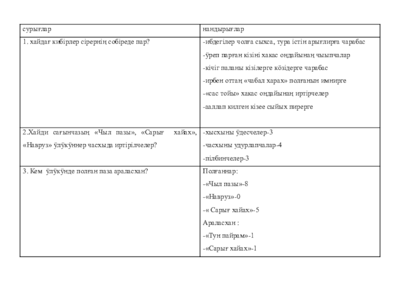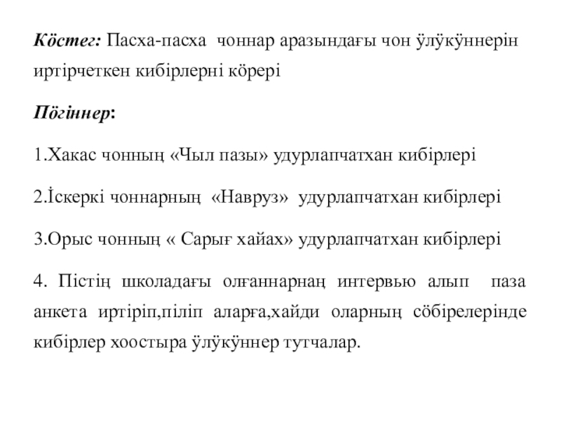 Кӧстег: Пасха-пасха чоннар аразындағы чон ӱлӱкӱннерiн иртiрчеткен кибiрлернi кӧрерiПӧгiннер:1.Хакас чонныӊ «Чыл пазы» удурлапчатхан кибiрлерi2.İскеркi чоннарныӊ «Навруз» удурлапчатхан кибiрлерi3.Орыс чонныӊ « Сарығ хайах» удурлапчатхан кибiрлерi4. Пiстiӊ школадағы олғаннарнаӊ интервью алып паза анкета иртiрiп,пiлiп аларға,хайди оларныӊ сӧбiрелерiнде кибiрлер