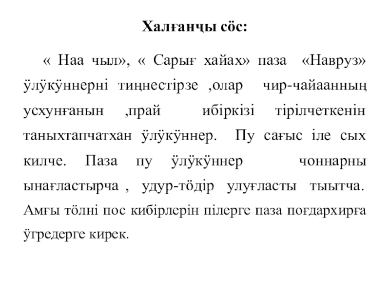 Халғанҷы сӧс:	« Наа чыл», « Сарығ хайах» паза «Навруз» ӱлӱкӱннернi тиӊнестiрзе ,олар чир-чайаанныӊ усхунғанын ,прай ибiркiзi тiрiлчеткенiн