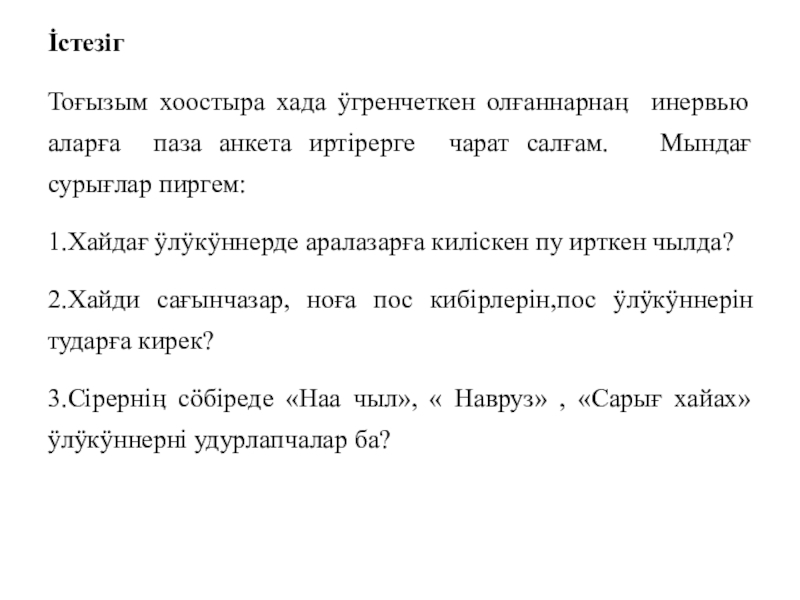 İстезiгТоғызым хоостыра хада ӱгренчеткен олғаннарнаӊ инервью аларға паза анкета иртiрерге чарат салғам.  Мындағ сурығлар пиргем:1.Хайдағ ӱлӱкӱннерде
