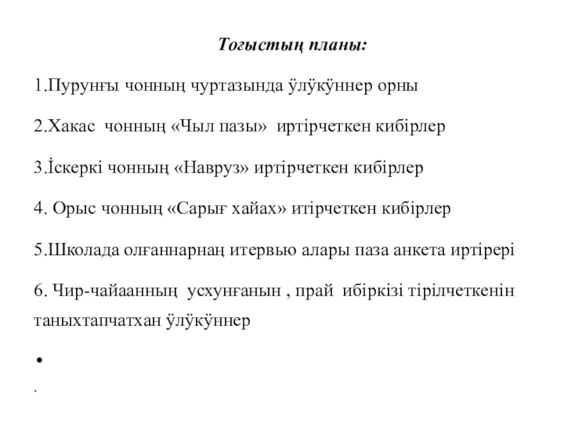Тоғыстыӊ планы:1.Пурунғы чонныӊ чуртазында ӱлӱкӱннер орны2.Хакас чонныӊ «Чыл пазы» иртiрчеткен кибiрлер3.İскеркi чонныӊ «Навруз» иртiрчеткен кибiрлер4. Орыс чонныӊ