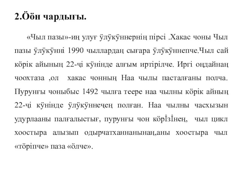 2.Öӧн чардығы.	«Чыл пазы»-иӊ улуғ ӱлӱкӱннернiӊ пiрсi .Хакас чоны Чыл пазы ӱлӱкӱннi 1990 чыллардаӊ сығара ӱлӱкӱннепче.Чыл сай кӧрiк