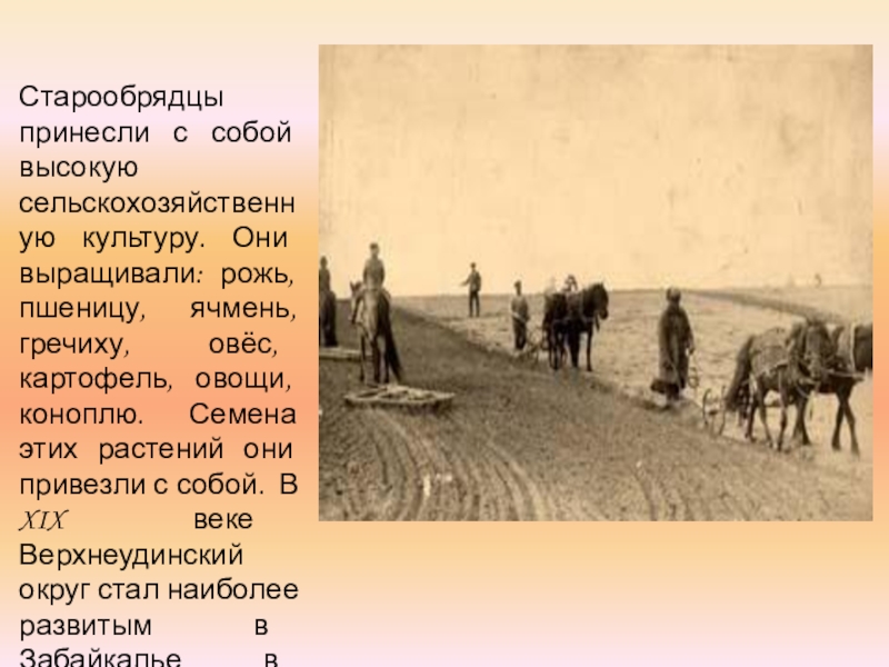ячмень, гречиху, овёс, картофель, овощи, коноплю. Семена этих растений они привезли с собой. В XIX веке Верхнеудинский округ стал наиболее развитым в Забайкалье в земледельческом отношении.