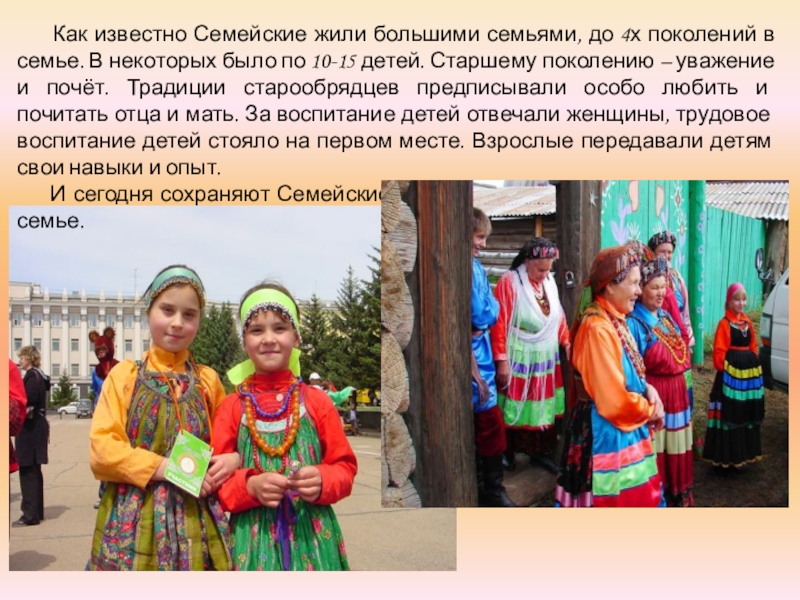 поколений в семье. В некоторых было по 10-15 детей. Старшему поколению – уважение и почёт. Традиции старообрядцев предписывали особо любить и почитать отца и мать. За воспитание детей отвечали женщины, трудовое воспитание детей стояло на первом месте. Взрослые передавали детям свои навыки и опыт.