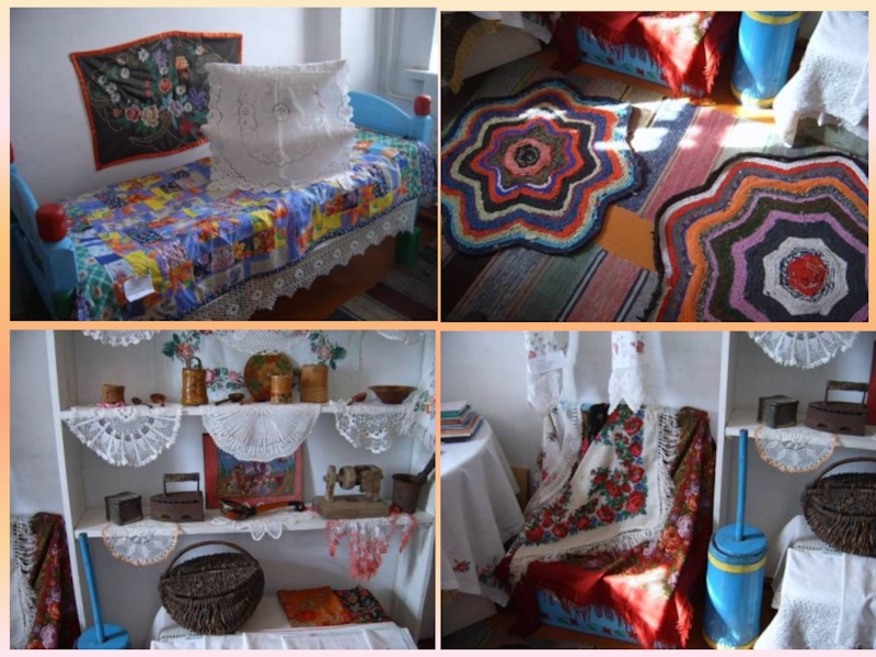 Слайд 15 Внутри избы чисто и опрятно. Пол застлан самотканой материей. В переднем
