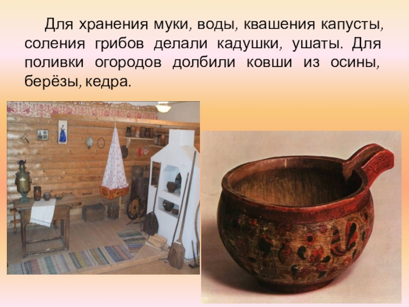 Слайд 12 Для хранения муки, воды, квашения капусты, соления грибов делали кадушки, ушаты.