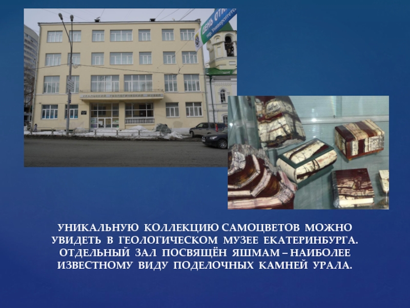 Слайд 9УНИКАЛЬНУЮ КОЛЛЕКЦИЮ САМОЦВЕТОВ МОЖНО УВИДЕТЬ В ГЕОЛОГИЧЕСКОМ МУЗЕЕ ЕКАТЕРИНБУРГА. ОТДЕЛЬНЫЙ ЗАЛ
