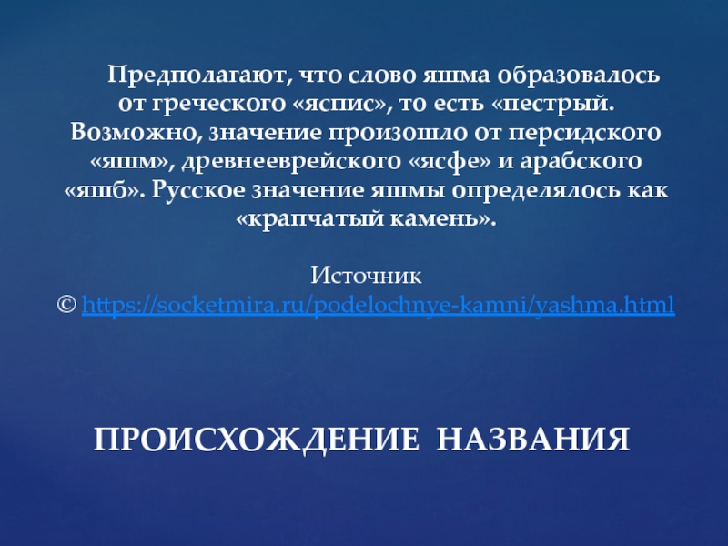 «пестрый. Возможно, значение произошло от персидского «яшм», древнееврейского «ясфе» и арабского «яшб». Русское значение яшмы определялось как «крапчатый камень».