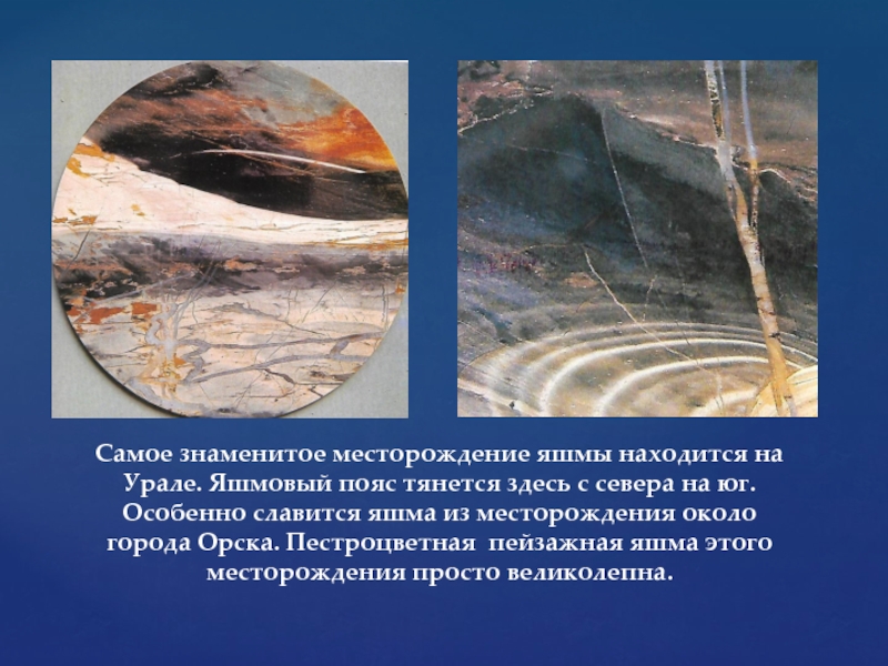 с севера на юг. Особенно славится яшма из месторождения около города Орска. Пестроцветная пейзажная яшма этого месторождения просто великолепна.
