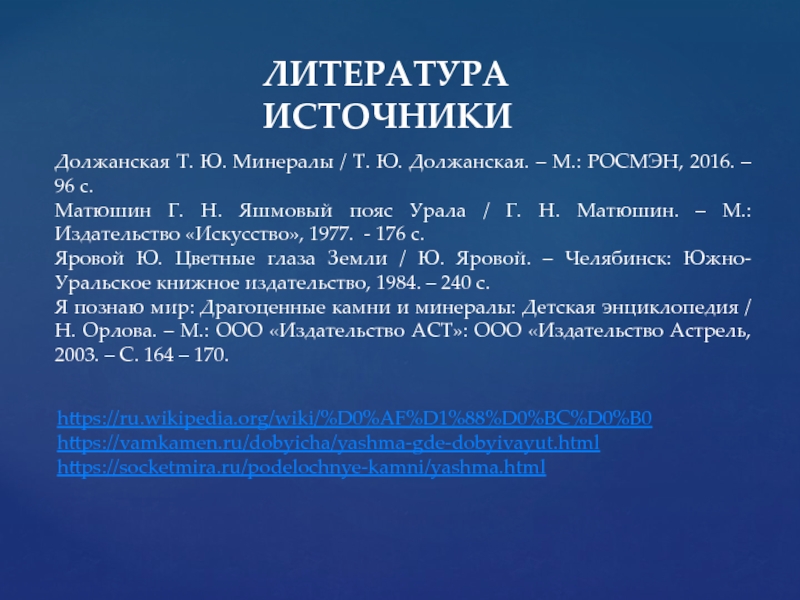 Я познаю мир: Драгоценные камни и минералы: Детская энциклопедия / Н. Орлова. – М.: ООО «Издательство АСТ»: ООО «Издательство Астрель, 2003. – С. 164 – 170.