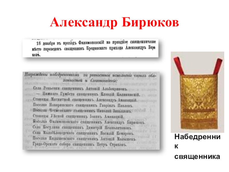Спустя два года,  Александр Бирюков- священник посёлка Филимоновского Троицкого уезда был награждён саном