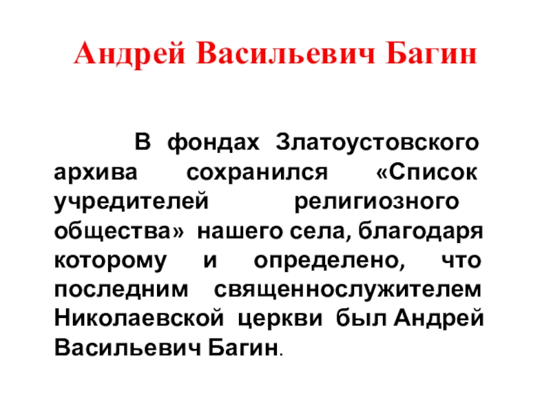 Златоустовского архива сохранился «Список учредителей религиозного общества» нашего села, благодаря которому и определено, что последним священнослужителем Николаевской церкви был Андрей Васильевич Багин.