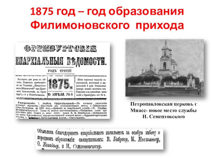 1875 год – год образования  Филимоновского прихода Петропавловская церковь г Миасс- новое место службы Н. Сементовского