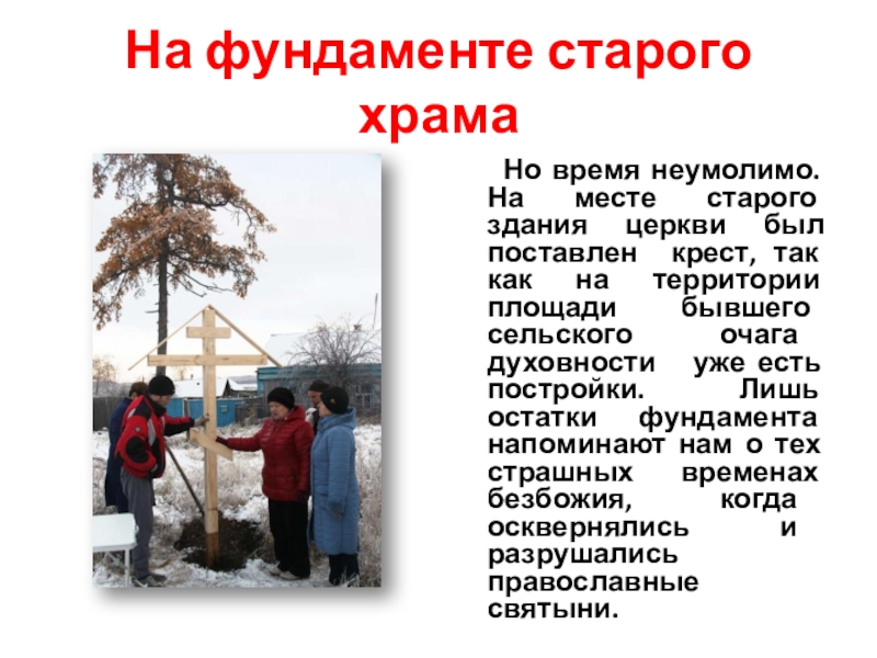 На фундаменте старого храма   Но время неумолимо.  На месте старого здания церкви был поставлен