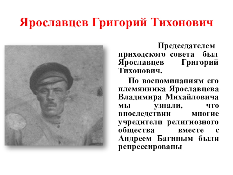 Ярославцев Григорий Тихонович   Председателем приходского совета был Ярославцев Григорий Тихонович.    По воспоминаниям
