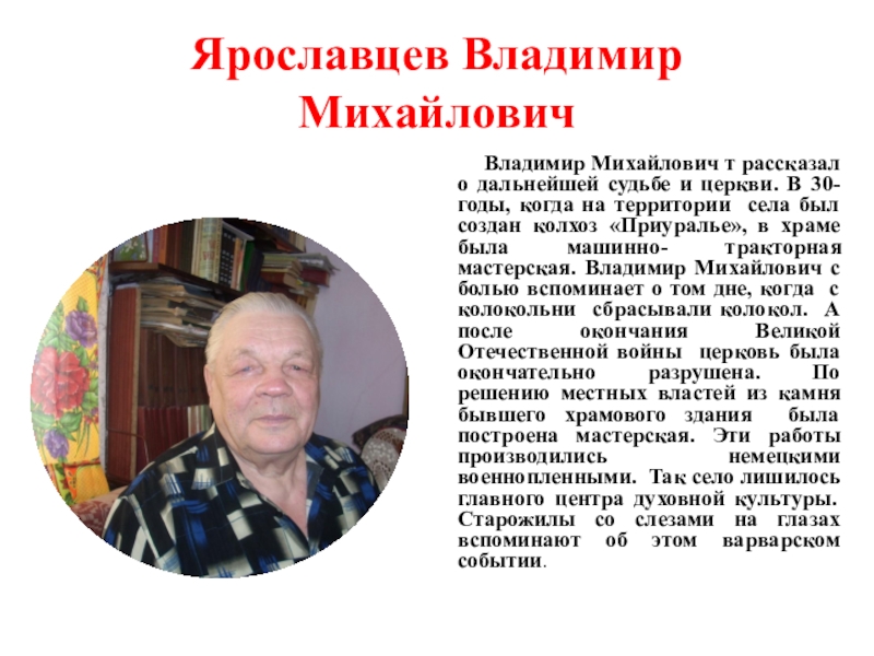 Ярославцев Владимир Михайлович     Владимир Михайлович т рассказал о дальнейшей судьбе и церкви. В
