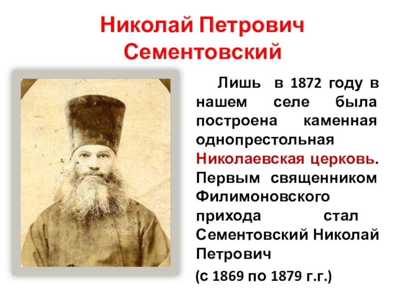 Николай Петрович Сементовский   Лишь в 1872 году в нашем селе была построена каменная однопрестольная Николаевская