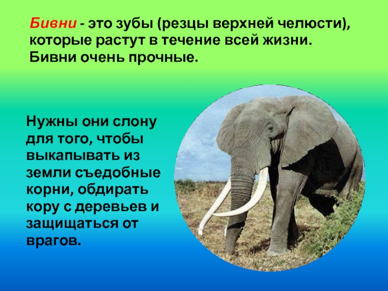 Нужны они слону для того, чтобы выкапывать из земли съедобные корни, обдирать кору с деревьев и защищаться от врагов.