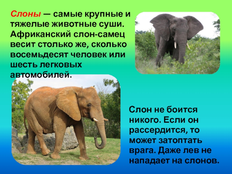 Слон не боится никого. Если он рассердится, то может затоптать врага. Даже лев не нападает на слонов.