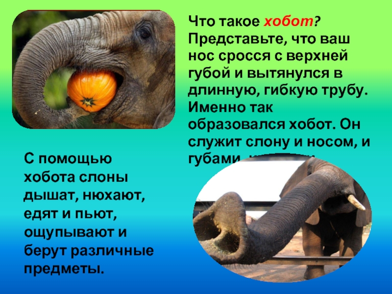 С помощью хобота слоны дышат, нюхают, едят и пьют, ощупывают и берут различные предметы.