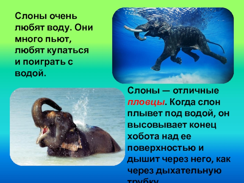 Слоны — отличные пловцы. Когда слон плывет под водой, он высовывает конец хобота над ее поверхностью и дышит через него, как через дыхательную трубку.