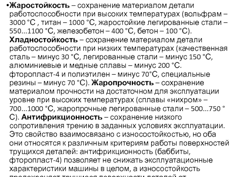 3000 °С , титан – 1000 °С, жаростойкие легированные стали – 550...1100 °С, железобетон – 400 °С, бетон – 100 °С). Хладностойкость – сохранение материалом детали работоспособности при низких температурах (качественная сталь – минус 30 °С, легированные стали – минус 150 °С, алюминиевые и медные сплавы – минус 200 °С. фторопласт-4 и полиэтилен – минус 70°С, специальные резины – минус 70 °С). Жаропрочность – сохранение материалом прочности на достаточном для эксплуатации уровне при высоких температурах (сплавы «нихром» – 700...1000 °С, жаропрочные легированные стали – 500...750 °С). Антифрикционность – сохранение низкого сопротивления трению в заданных условиях эксплуатации. Это свойство взаимосвязано с износостойкостью, но оба они относятся к различным критериям работы поверхностей трущихся деталей: антифрикционность (баббиты, фторопласт-4) позволяет не снижать эксплуатационные характеристики машины в целом, а износостойкость предохраняет трущиеся поверхности деталей от разрушения истиранием (трением).