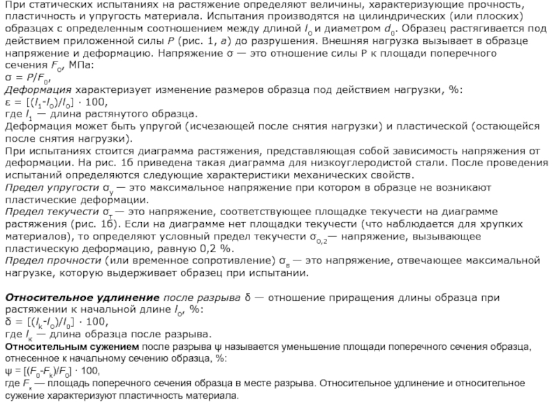 При испытаниях стоится диаграмма растяжения, представляющая собой зависимость напряжения от деформации. На рис. 1б приведена такая диаграмма для низкоуглеродистой стали. После проведения испытаний определяются следующие характеристики механических свойств.