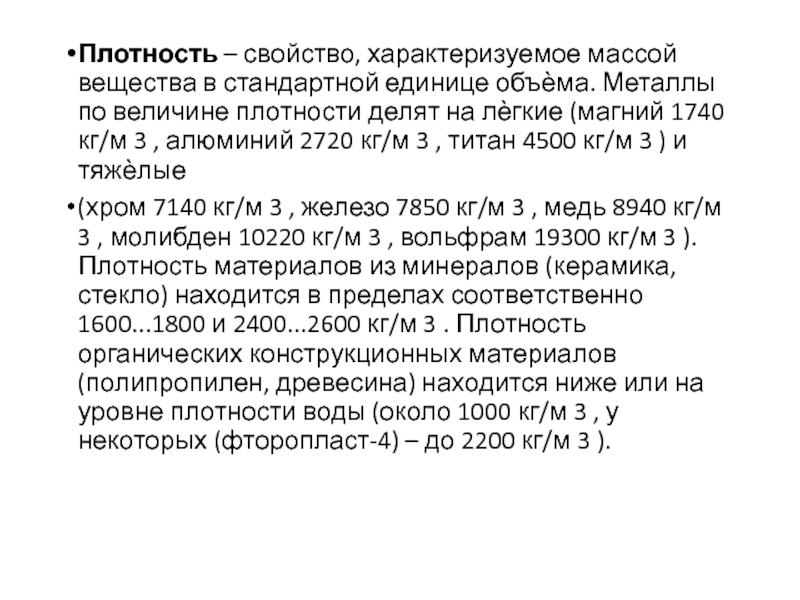 (хром 7140 кг/м 3 , железо 7850 кг/м 3 , медь 8940 кг/м 3 , молибден 10220 кг/м 3 , вольфрам 19300 кг/м 3 ). Плотность материалов из минералов (керамика, стекло) находится в пределах соответственно 1600...1800 и 2400...2600 кг/м 3 . Плотность органических конструкционных материалов (полипропилен, древесина) находится ниже или на уровне плотности воды (около 1000 кг/м 3 , у некоторых (фторопласт-4) – до 2200 кг/м 3 ).