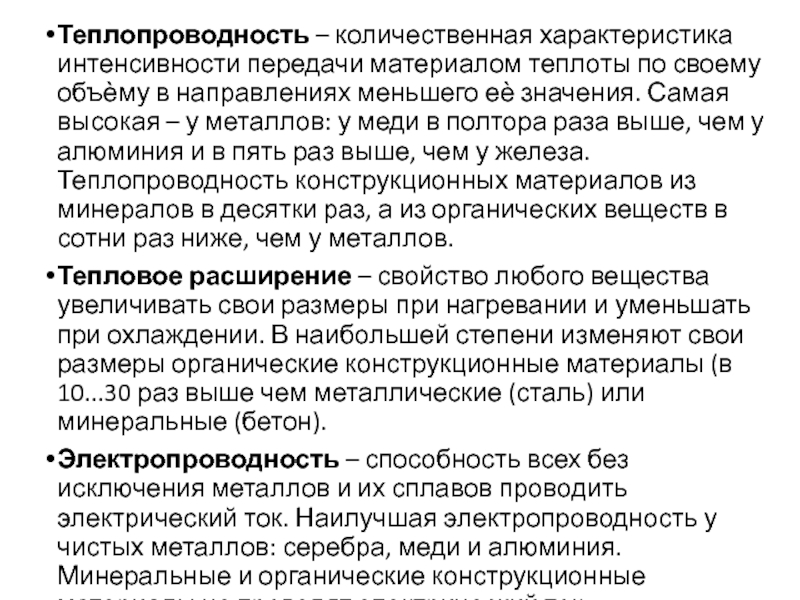 в направлениях меньшего еѐ значения. Самая высокая – у металлов: у меди в полтора раза выше, чем у алюминия и в пять раз выше, чем у железа. Теплопроводность конструкционных материалов из минералов в десятки раз, а из органических веществ в сотни раз ниже, чем у металлов.