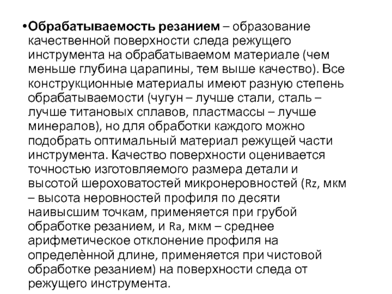 Слайд 27Обрабатываемость резанием – образование качественной поверхности следа режущего инструмента на обрабатываемом
