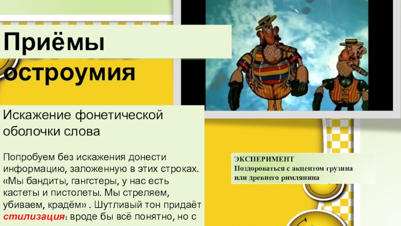 строках. «Мы бандиты, гангстеры, у нас есть кастеты и пистолеты. Мы стреляем, убиваем, крадём» . Шутливый тон придаёт стилизация: вроде бы всё понятно, но с итальянским акцентом.
