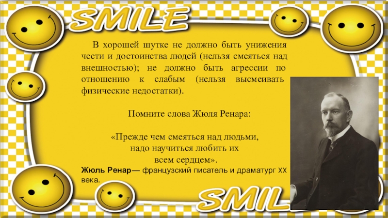 Слайд 15 В хорошей шутке не должно быть унижения чести и
