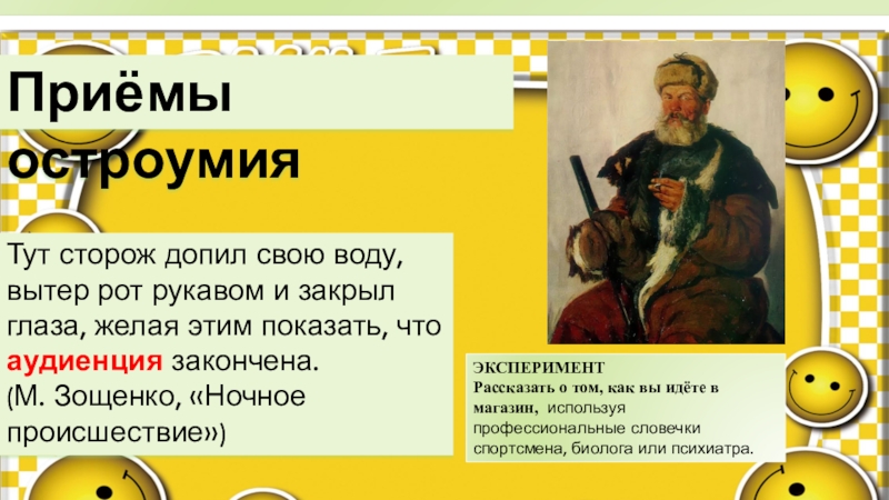 Слайд 9Тут сторож допил свою воду, вытер рот рукавом и закрыл глаза,