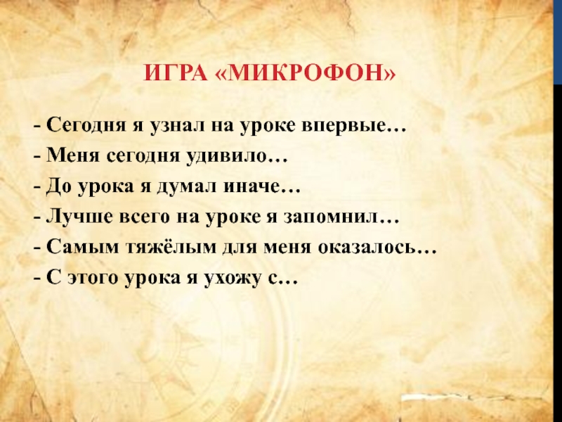 Игра «Микрофон»- Сегодня я узнал на уроке впервые…- Меня сегодня удивило…- До урока я думал иначе…- Лучше