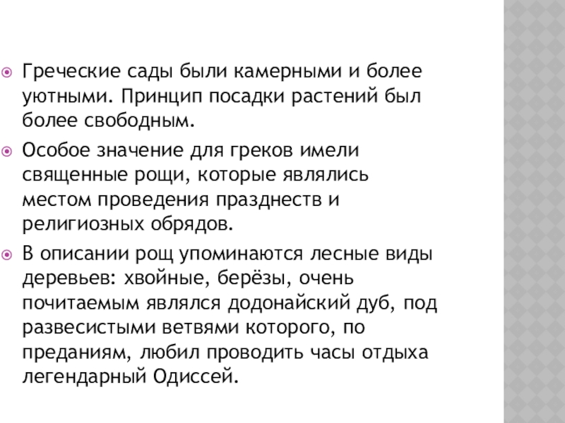 Слайд 66Греческие сады были камерными и более уютными. Принцип посадки растений был