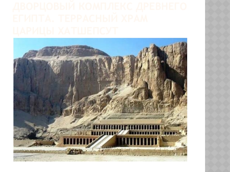 Слайд 5Дворцовый комплекс Древнего Египта. Террасный храм царицы Хатшепсут