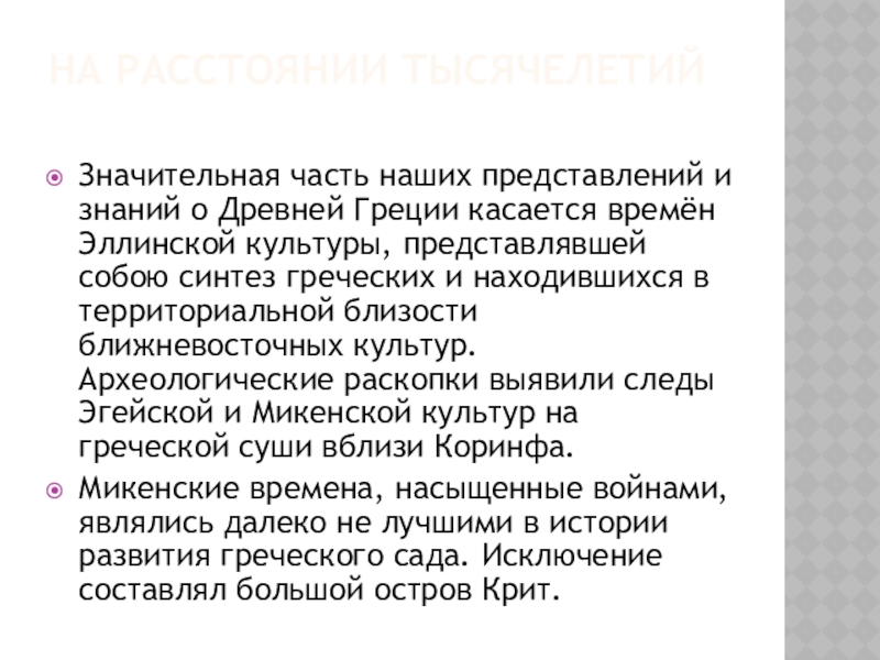 Микенские времена, насыщенные войнами, являлись далеко не лучшими в истории развития греческого сада. Исключение составлял большой остров Крит.